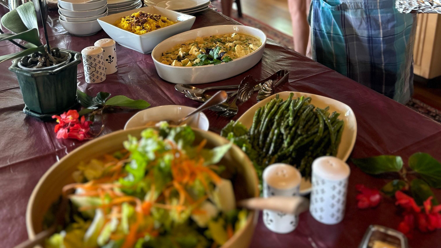 Sumptuously spiced fresh vegetables, lentils, and rice (with ghee on the side!) enjoyed in good company on the large covered lanai overlooking the jungle valley below.
