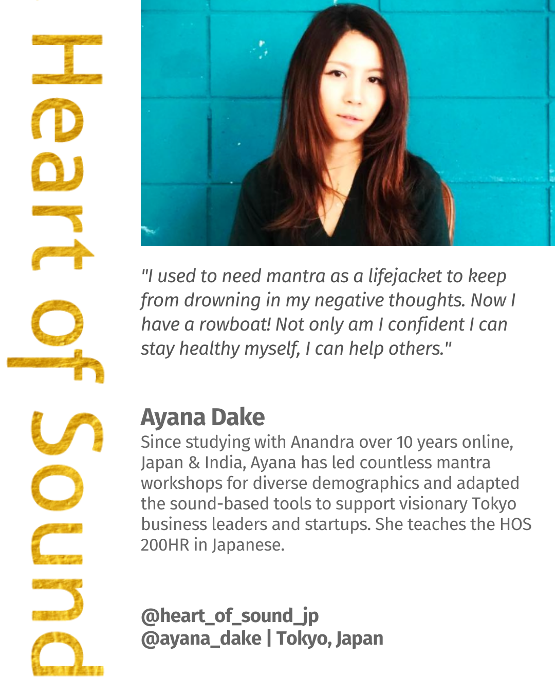 After working as a singer, she obtained a yoga instructor qualification. She participated in the start-up of Heart of Sound with Anandra and others, and contributed to the spread of "heart yoga" in Tokyo, India, and New York. She also runs the Heart of Sound Japan school.